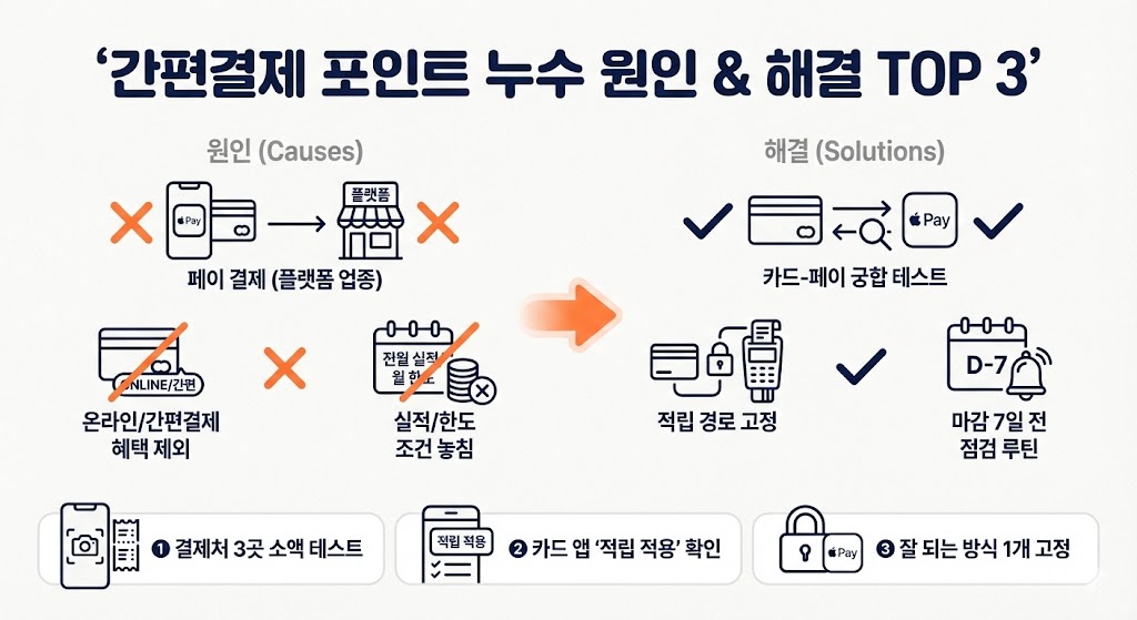 해결은 ①카드-페이 궁합 테스트 ②적립 잘 되는 결제 경로를 고정 ③마감 7일 전 점검 루틴으로 끝냅니다.