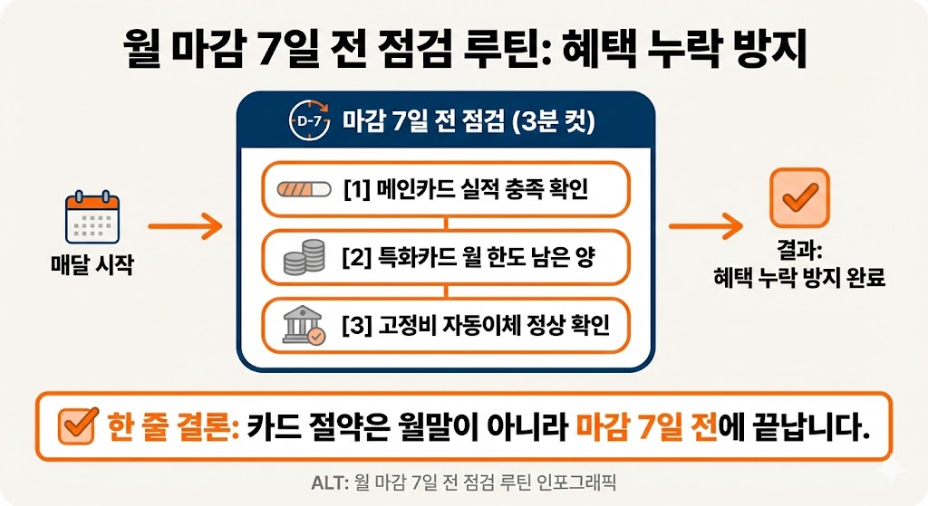 6) 월 한도·횟수·우대조건은 “마감 7일 전 점검”으로 끝낸다