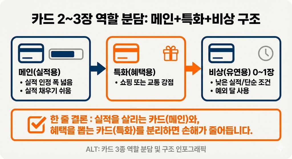 해결은 ①소비를 고정비/쇼핑/교통으로 고정 ②메인(실적용) 1장 + 특화(혜택용) 1장 + 비상(유연용) 1장 구조 ③자주 쓰는 가맹점은 소액 테스트로 결제 루트 고정 ④마감 7일 전 점검으로 끝냅니다.