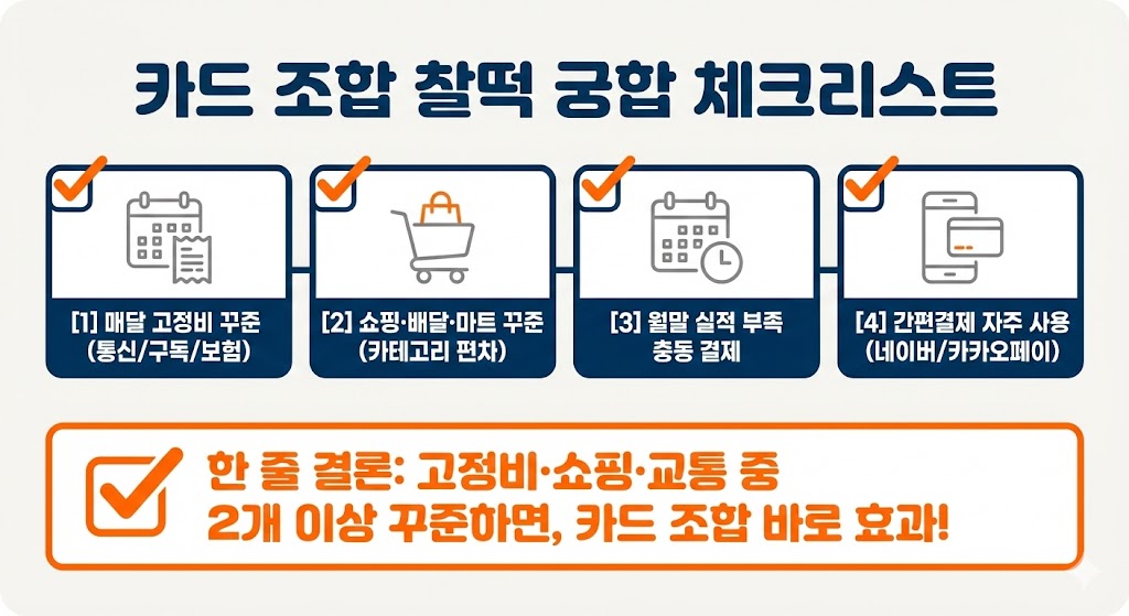 고정비·쇼핑·교통 중 2개 이상이 꾸준하면, 카드 조합은 “바로 효과”가 납니다.