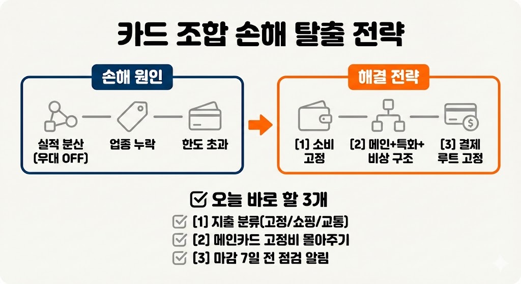 카드 조합에서 손해 보는 이유는 대부분 ①실적 분산으로 우대 혜택 OFF ②업종코드(MCC)/결제 경로 때문에 혜택 누락 ③월 한도·횟수 제한을 놓치기 때문입니다.