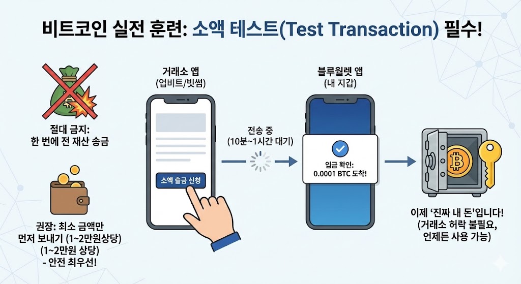 "한 번에 전 재산 다 보내야지!" -> 절대 금지입니다. 처음에는 *최소 출금 가능 금액(또는 1~2만 원 정도)*만 먼저 보내봅니다. 수수료가 조금 더 들더라도, 안전이 최우선입니다.