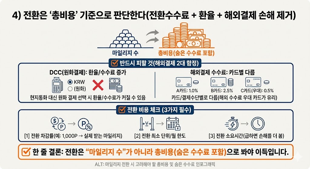 전환은 “마일리지 수”가 아니라 **총비용(숨은 수수료 포함)**으로 봐야 이득입니다.