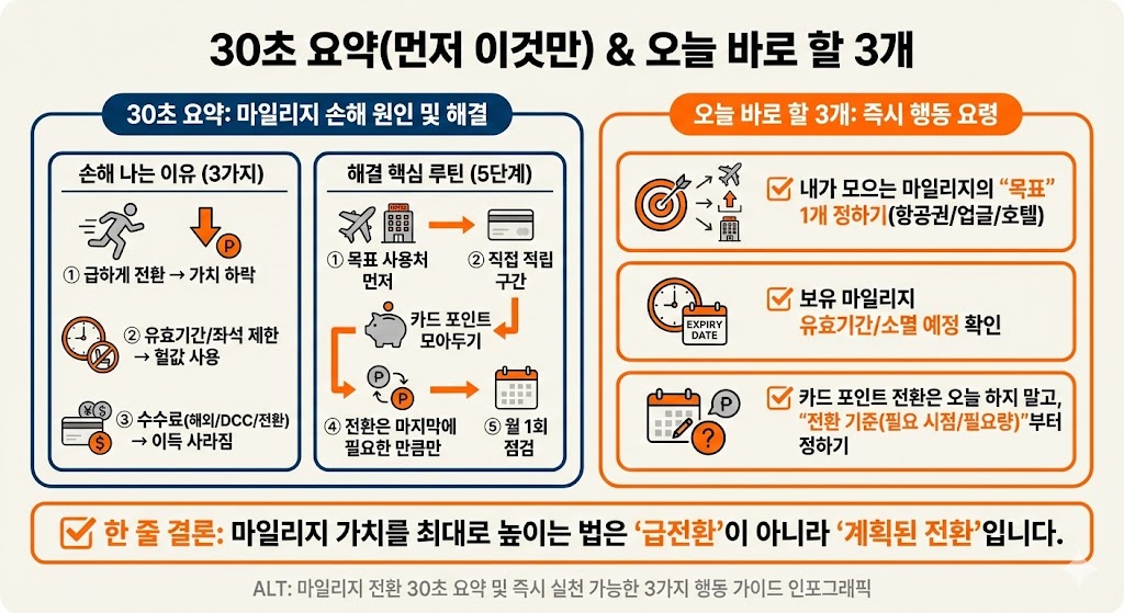 - 카드 포인트 전환은 오늘 하지 말고, “전환 기준(필요 시점/필요량)”부터 정하기