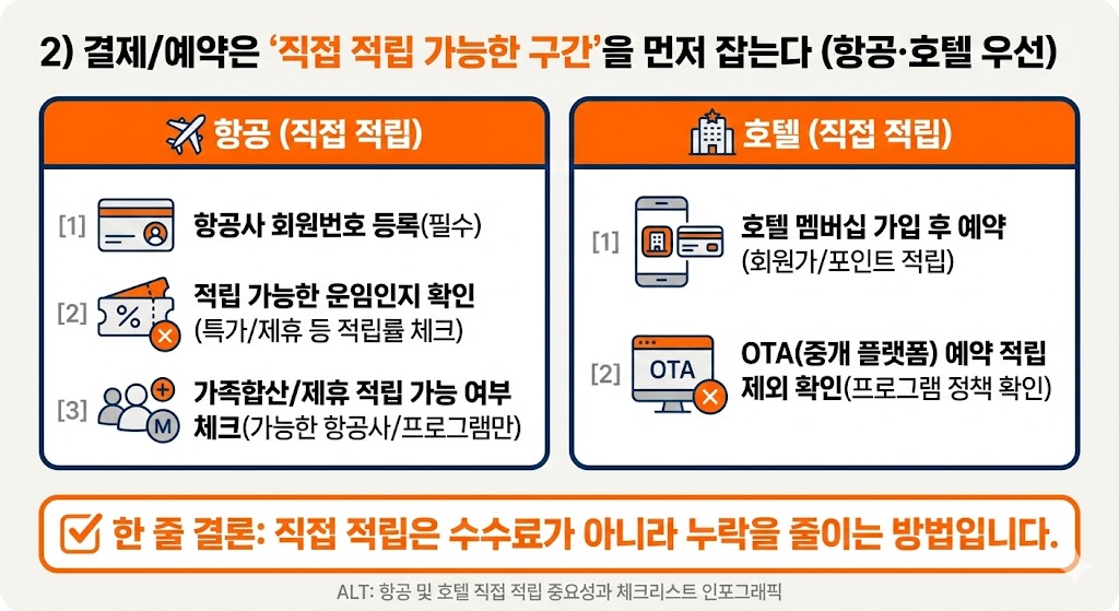 2) 결제/예약은 ‘직접 적립 가능한 구간’을 먼저 잡는다(항공·호텔 우선)