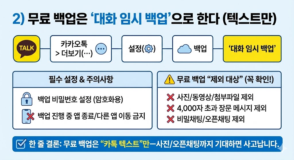 무료 백업은 “카톡 텍스트”만—사진/오픈채팅까지 기대하면 사고납니다.