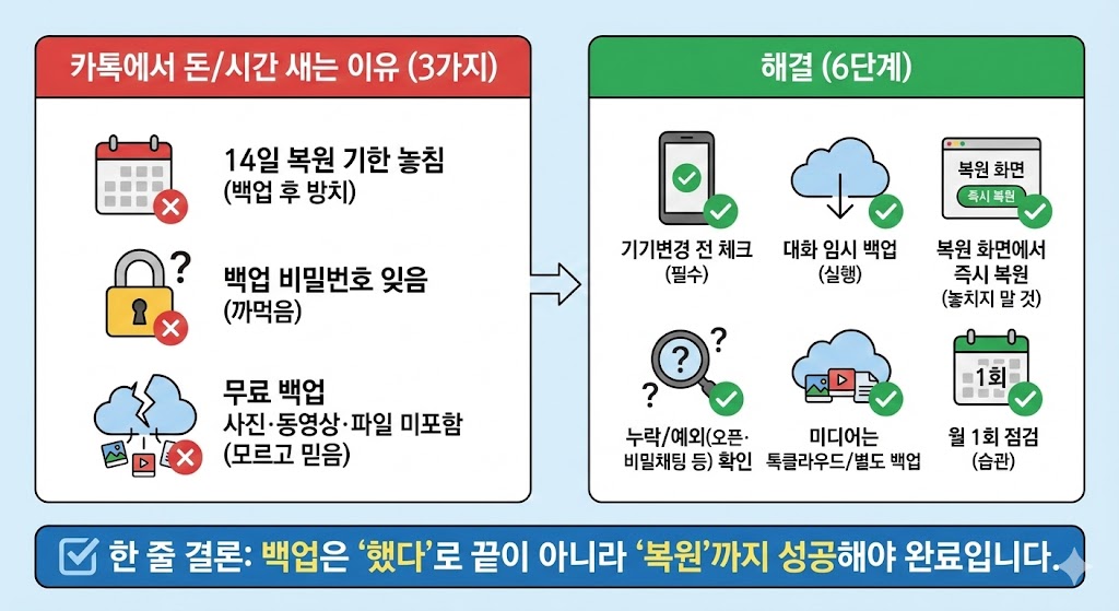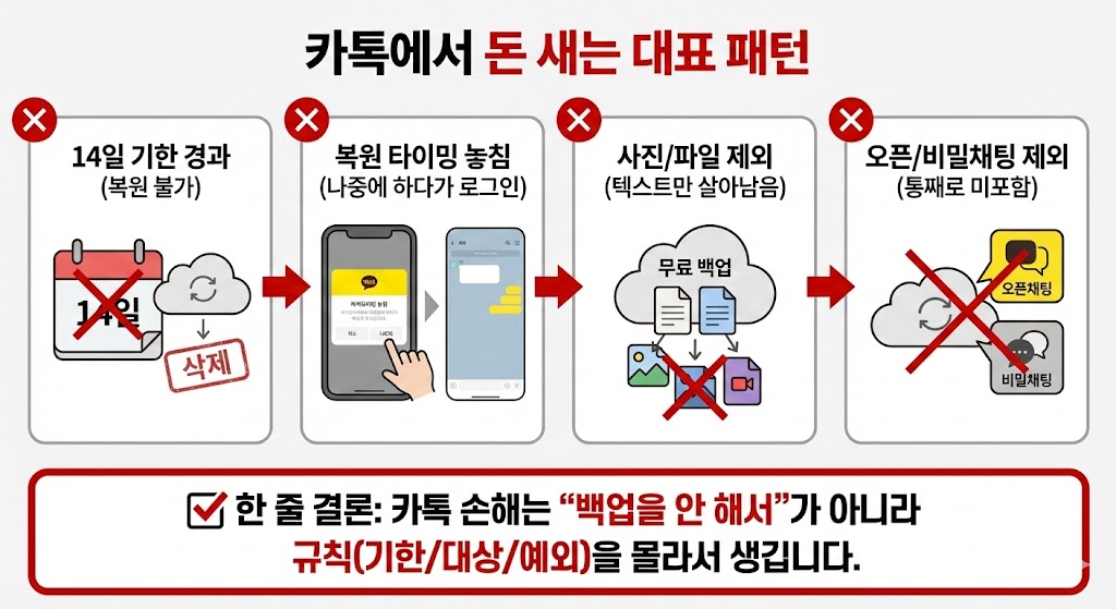 카톡에서 돈/시간이 새는 이유는 ①백업 해놓고 **복원 기한(14일)**을 놓치거나 ②백업 비밀번호를 잊거나 ③무료 백업에 사진·동영상·파일이 안 들어간다는 걸 모르고 믿기 때문입니다.