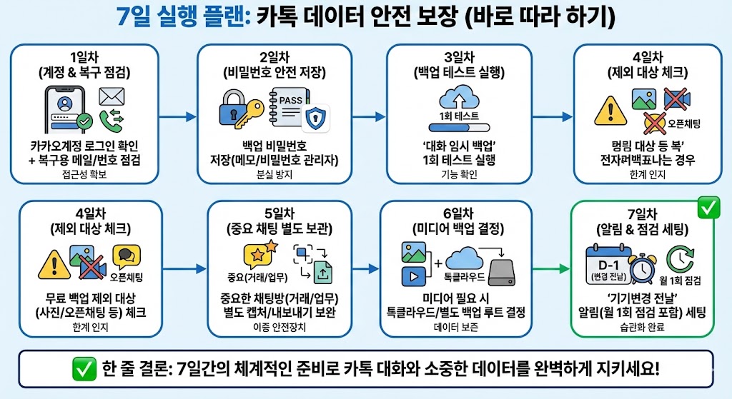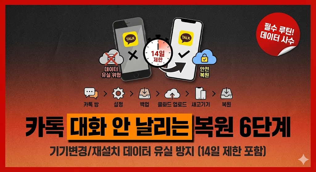 카카오톡 대화 백업은 무료로 가능하지만 복원 기한 14일, 비번 분실 시 복원 불가, 사진/파일 제외 등 함정이 있습니다. 기기변경 전 준비→임시 백업→복원→누락 점검→미디어 대비→월 1회 점검까지 6단계 체크리스트로 정리했습니다.