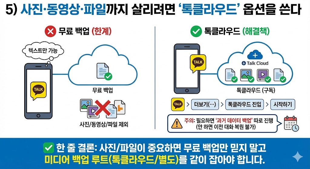 사진/파일이 중요하면 무료 백업만 믿지 말고 **미디어 백업 루트(톡클라우드/별도)**를 같이 잡아야 합니다.