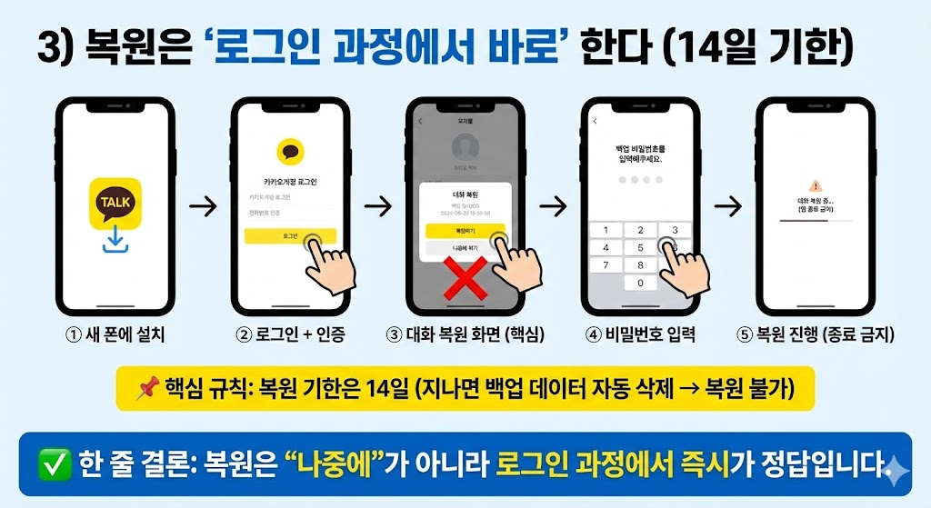 카톡은 백업보다 복원에서 실수가 터집니다(기한·비번·복원 화면).