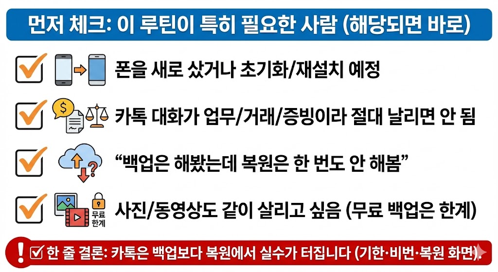 카톡은 ‘백업 1번’이 아니라 월 1회 점검이 대화 유실을 막습니다.