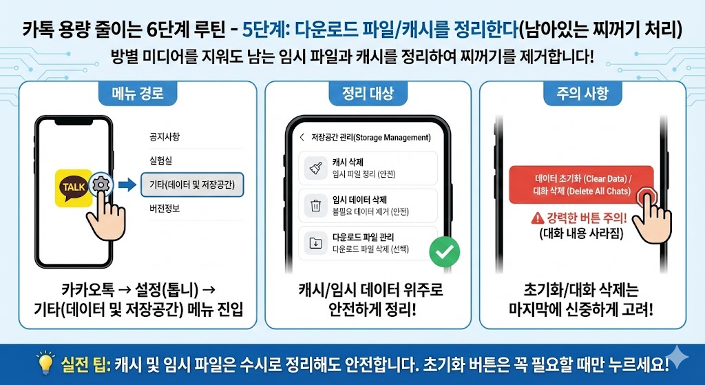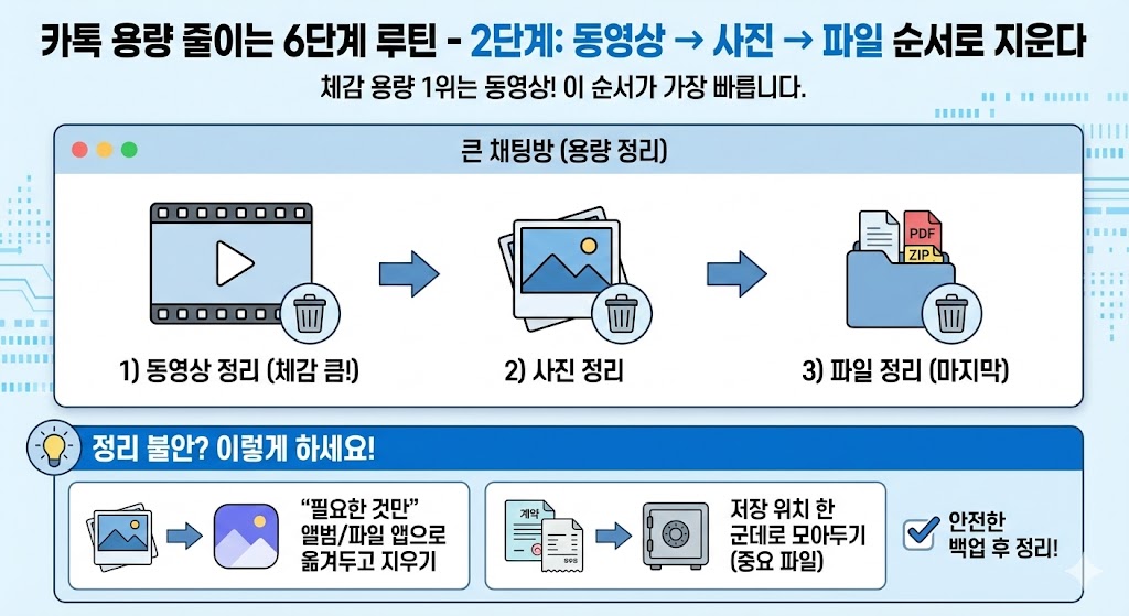 해결은 ①채팅방별 저장공간에서 큰 방부터 정리 ②자동 다운로드를 상황에 맞게 줄이기 ③사진/동영상 저장 옵션 점검 ④파일/다운로드 정리 ⑤캐시 정리 ⑥재발 방지(주 1회 5분)로 끝냅니다.