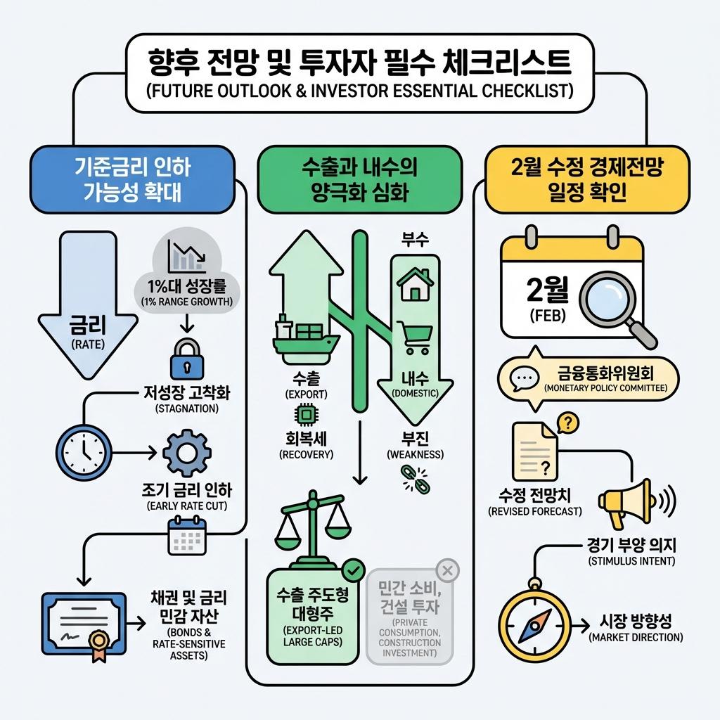 - 예상보다 낮은 1%대 성장률은 한국은행의 통화 정책 전환(Pivot) 압력을 높이는 핵심 요인입니다.