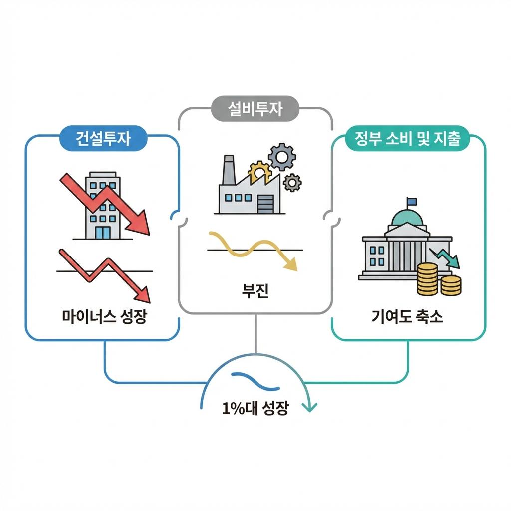 - 건설 및 설비 투자의 동반 감소가 성장 동력을 심각하게 약화시켰습니다. 부동산 PF 부실 우려와 대외 불확실성은 기업의 신규 투자를 제한하여, GDP 구성 항목 중 투자 부문의 역성장을 초래했습니다.