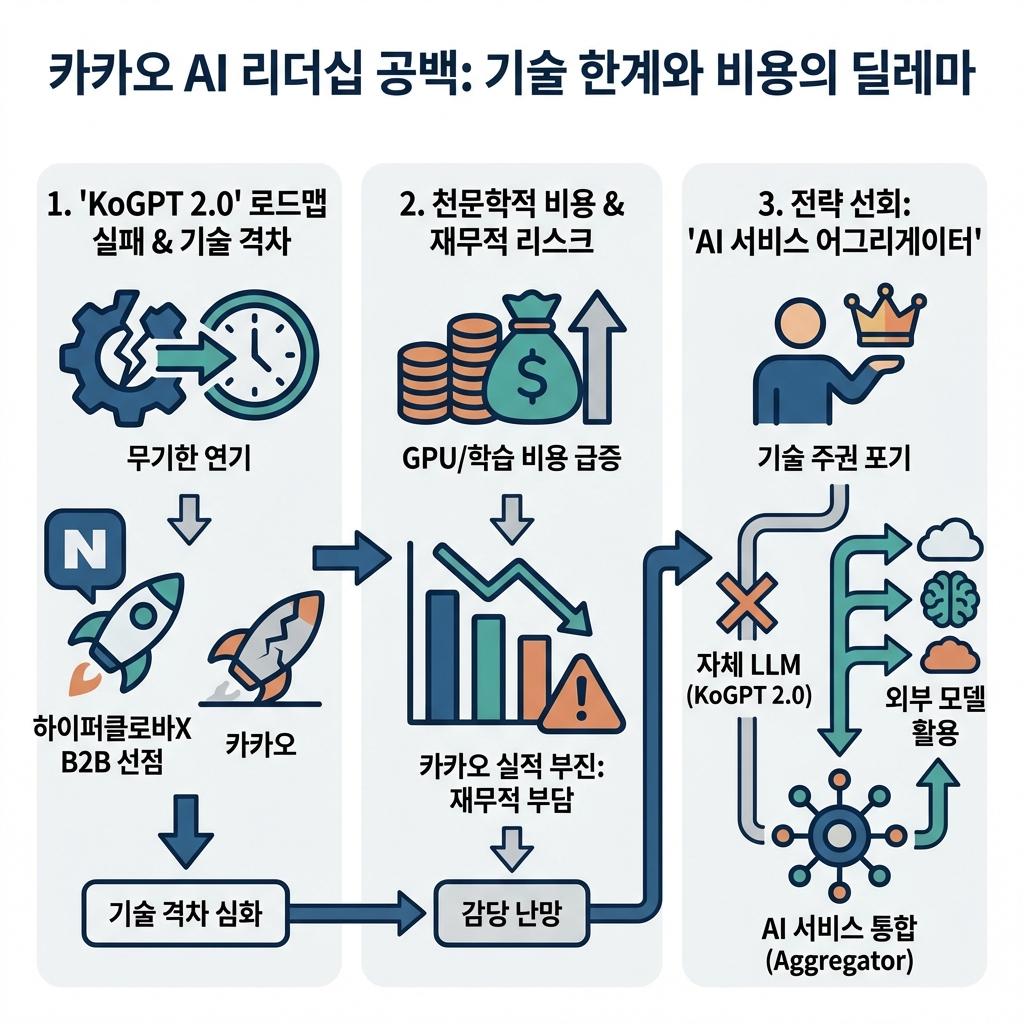 카카오 AI 부문 수장의 사퇴는 단순한 인사가 아닌, 기존 'KoGPT 2.0' 중심의 로드맵이 실패했음을 자인하는 강력한 시그널입니다.
