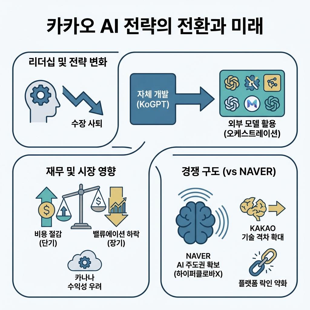 카카오 AI 수장의 사퇴와 전략 수정은 자체 모델 개발의 한계를 인정하고 외부 모델 활용을 통한 효율성을 추구하겠다는 의도로 풀이됩니다.
