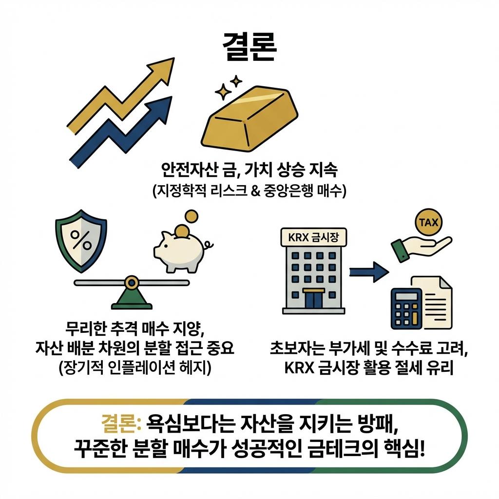- 실물 금을 살 때는 **부가가치세 10%**와 수수료가 즉시 발생합니다.
