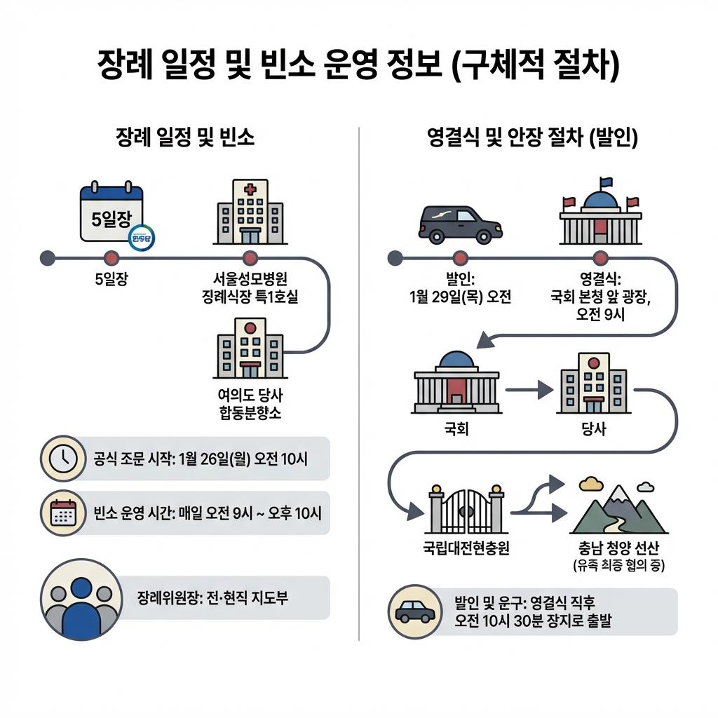 발인은 장례 마지막 날인 1월 29일(목) 오전에 진행되며, 영결식은 국회 본관 앞에서 엄수될 예정입니다. 운구 행렬은 고인이 생전 몸담았던 국회와 당사를 경유하여 장지로 이동합니다.