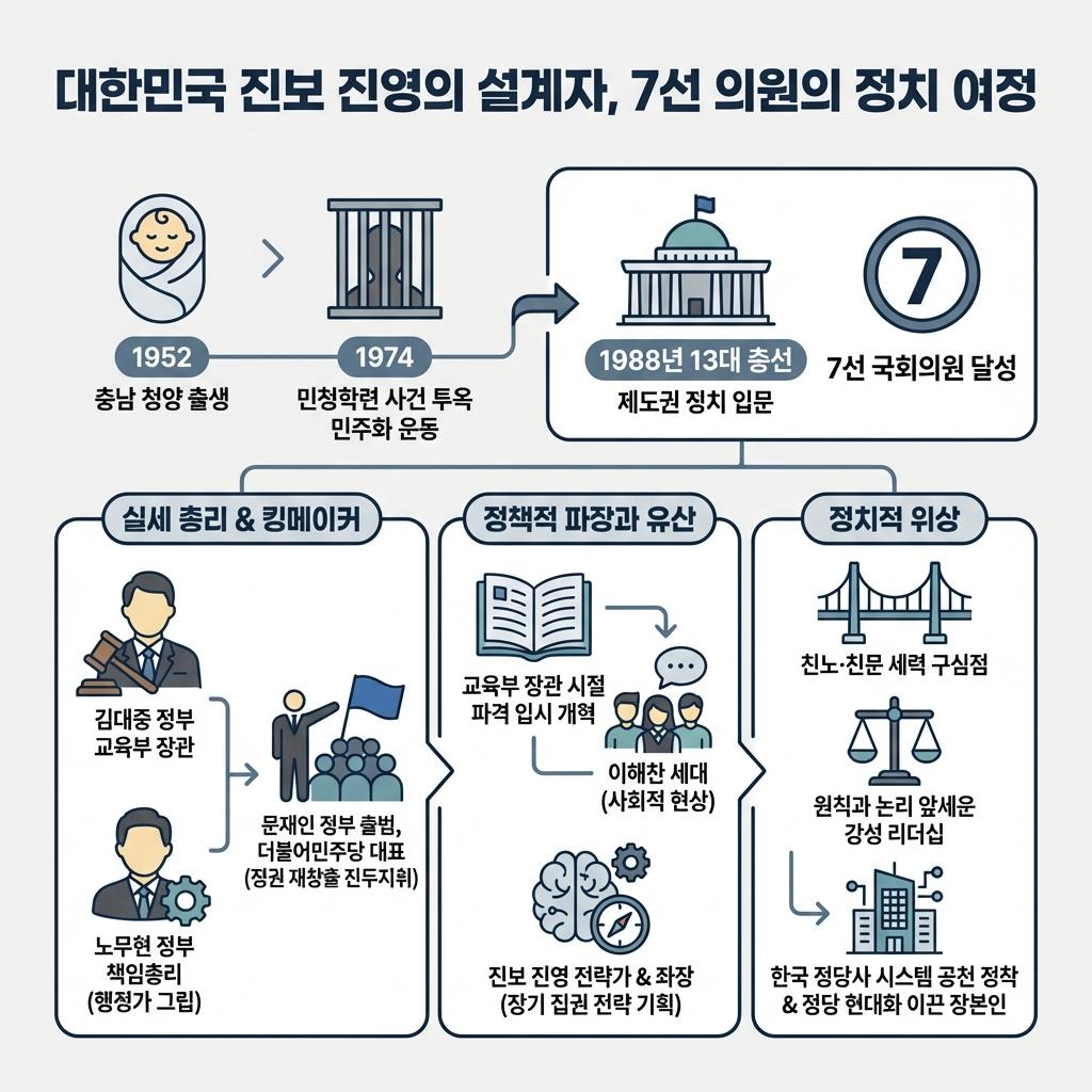 - 정책적 파장과 유산: 교육부 장관 재임 시절 단행한 파격적인 입시 개혁은 **‘이해찬 세대’**라는 사회적 현상을 만들어낼 만큼 영향력이 컸습니다. 그는 단순한 정치인을 넘어 진보 진영의 장기 집권 전략을 기획하는 **‘전략가’**이자 **‘좌장’**으로 평가받습니다.