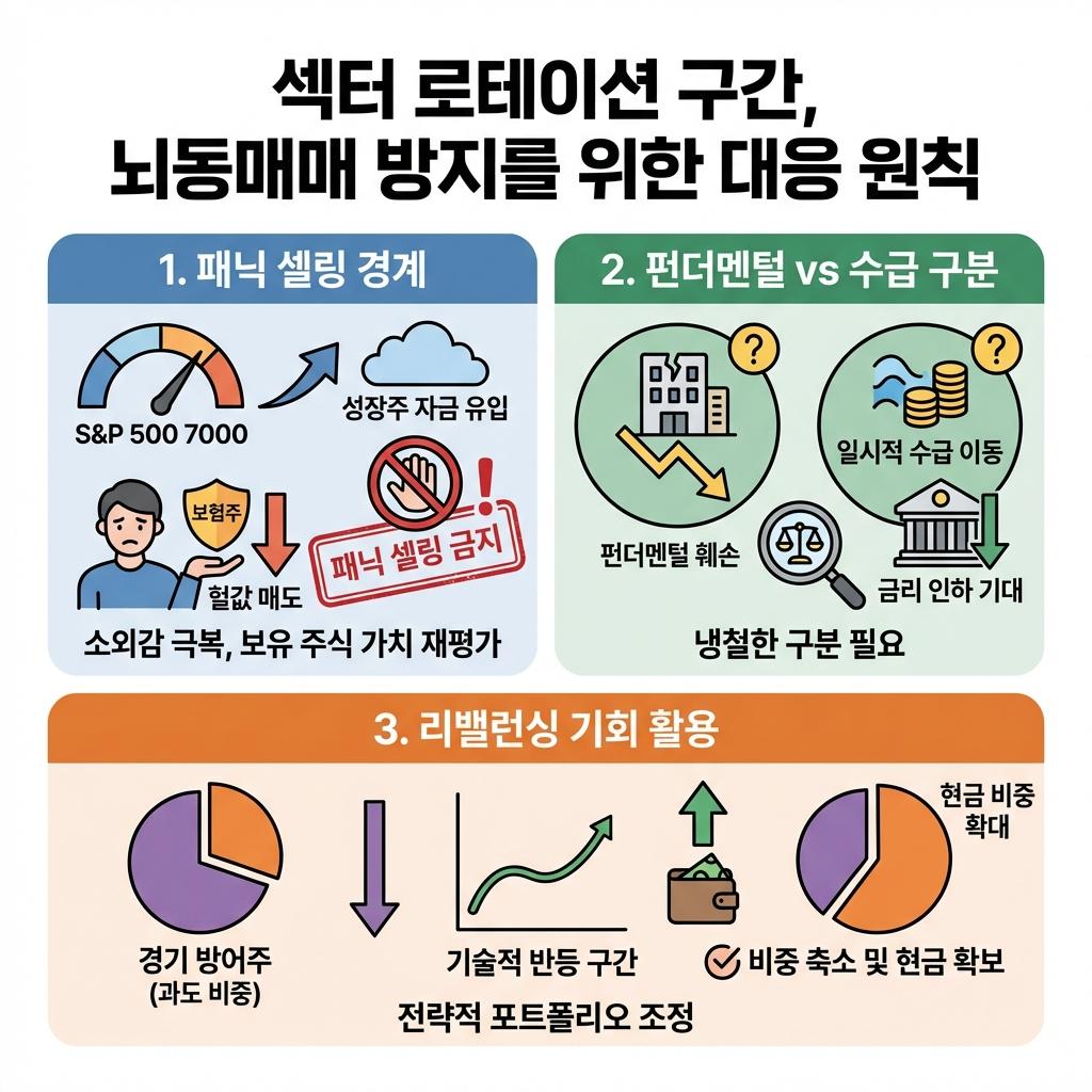 - 지수가 S&P500 7000 포인트에 근접하며 성장주로 자금이 쏠릴 때, 소외감을 이기지 못하고 보유한 보험주를 헐값에 매도하는 패닉 셀링을 가장 경계해야 합니다.