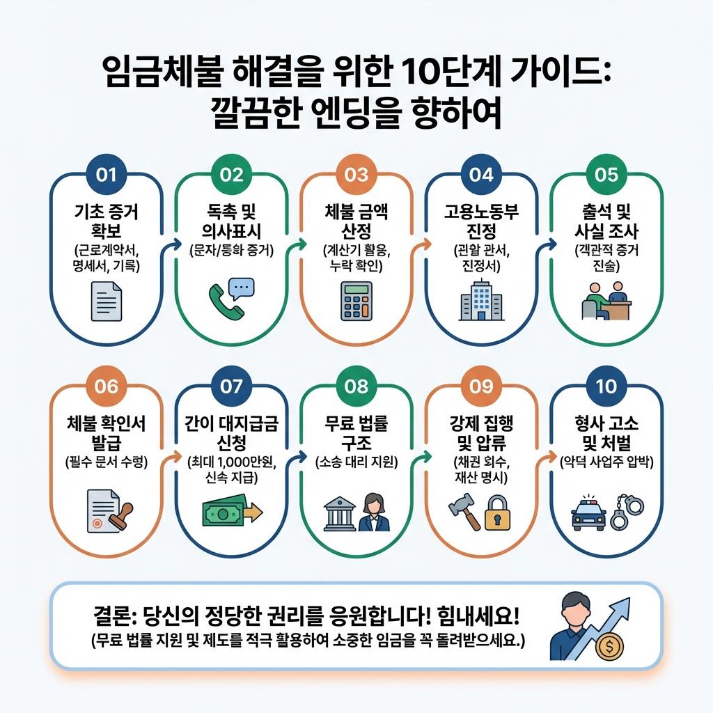 해결되지 않을 경우 대한법률구조공단의 무료 지원을 받아 민사 소송과 강제 집행을 진행하고, 형사 고소를 통해 사업주를 압박해야 합니다.