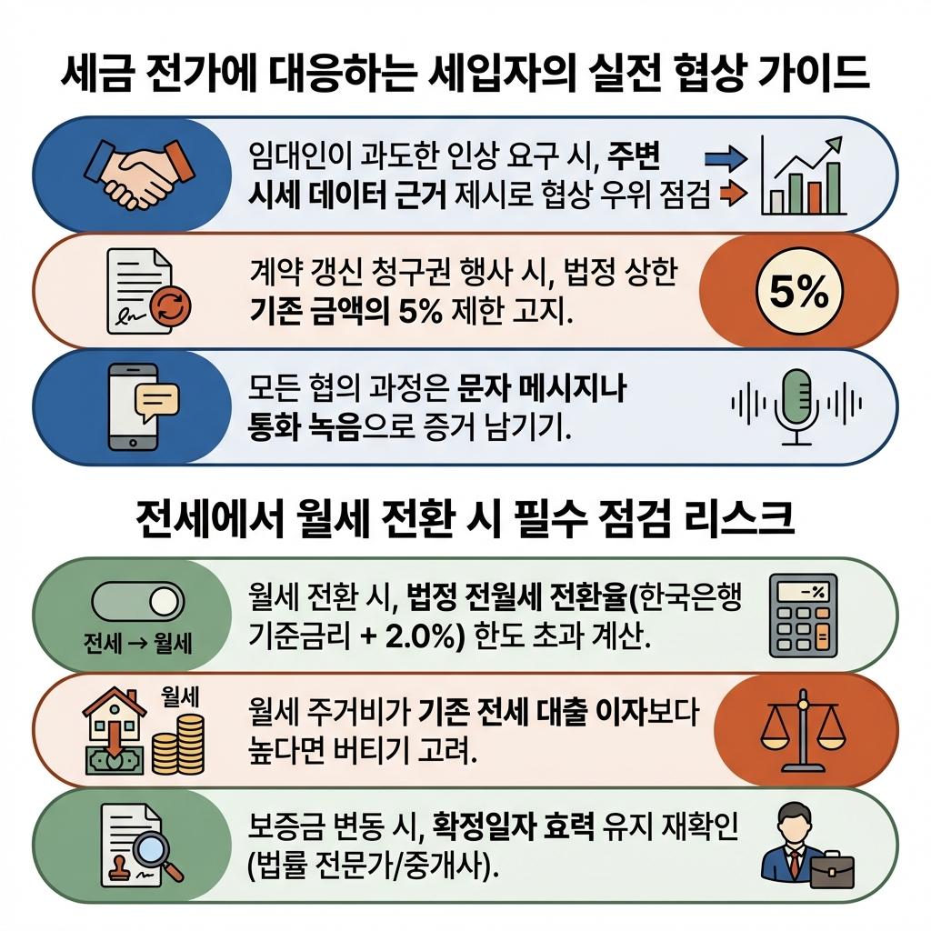 세입자는 계약갱신청구권을 활용해 인상률을 5%로 제한하거나 주변 실거래가 데이터를 기반으로 협상 우위를 점해야 합니다.