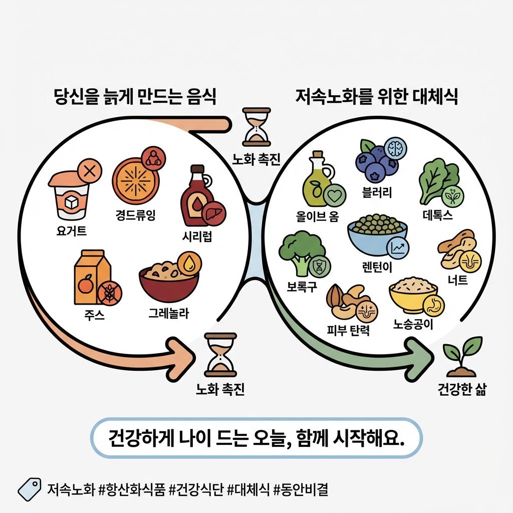 우리가 건강식으로 착각하여 자주 섭취하지만 실제로는 신체 나이를 늙게 만드는 의외의 음식 5가지와 이를 완벽하게 대신할 대체식 7가지를 통해 진정한 항노화 식습관을 제안합니다.