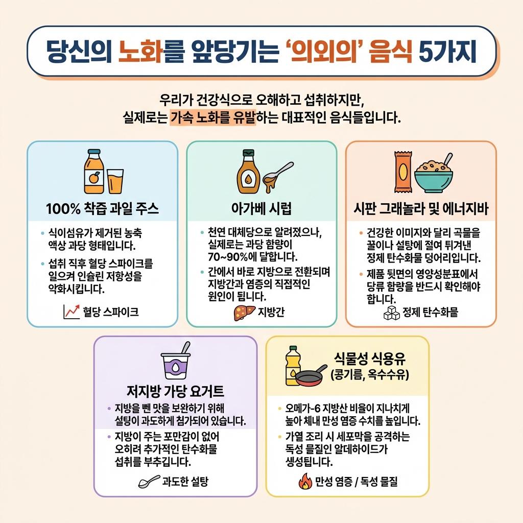 우리가 건강식으로 오해하고 섭취하지만, 실제로는 가속 노화를 유발하는 대표적인 음식들입니다.