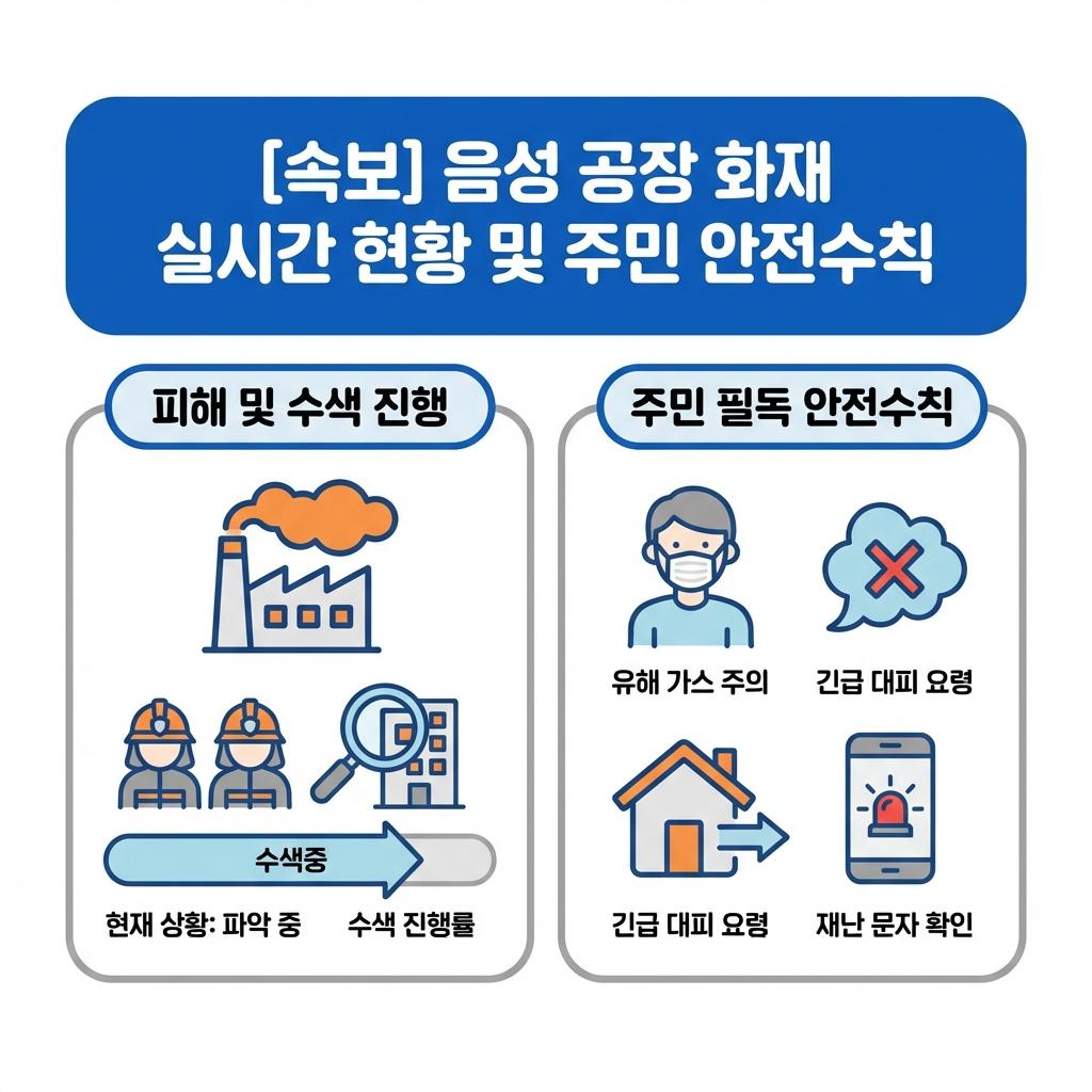 충북 음성 공장 화재의 현재 피해 상황과 소방 당국의 수색 및 진화 작업 현황을 정리했습니다.