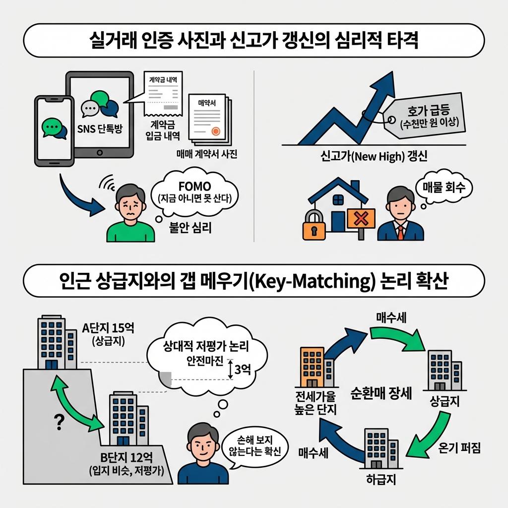 - 특정 지역이나 단지에 대한 호재성 메시지가 유포되는 즉시 **군중 심리(Herding Behavior)**가 발동하여 매수세가 쏠리는 현상이 발생합니다.