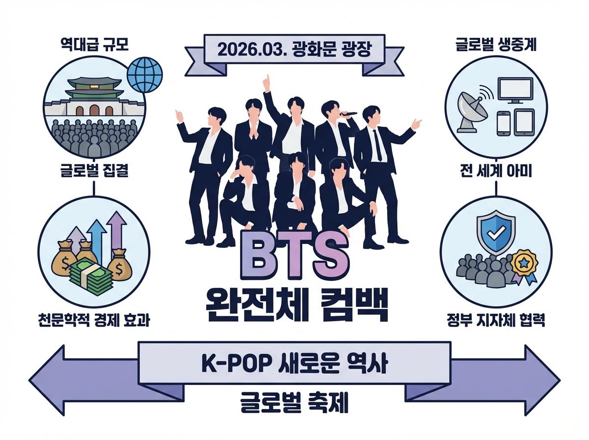 - 2026년 3월, 방탄소년단이 대한민국 서울의 심장부인 광화문 광장에서 역사적인 공연을 펼칩니다.