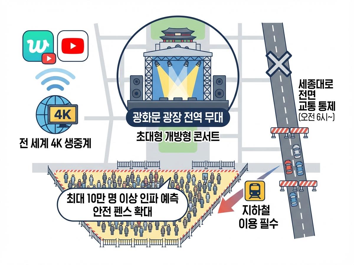 - 현장 인파를 고려하여 광화문 일대 교통이 통제되며 글로벌 플랫폼을 통한 동시 생중계가 확정되었습니다.