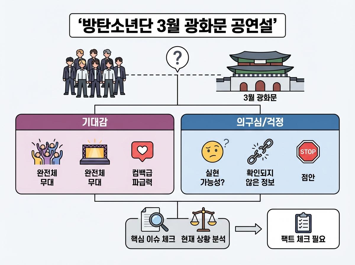 갑작스럽게 들려온 3월 광화문 공연 소식에 반가움보다는 "정말 가능한 일일까?"라는 의구심과 걱정이 먼저 드는 분들도 많으실 겁니다.