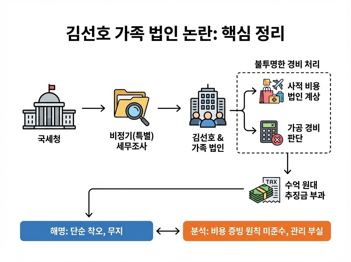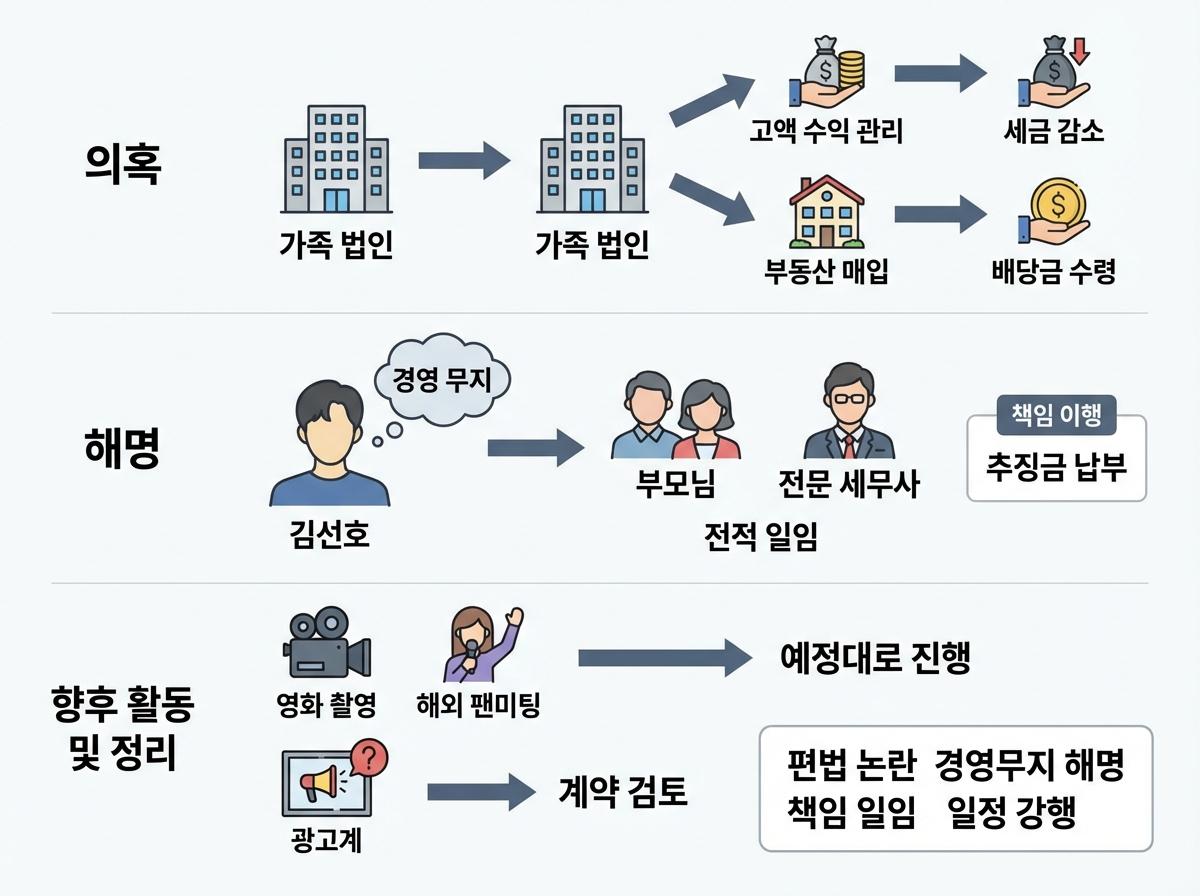 김선호 측은 즉각 고의적 탈세가 아닌 세무 지식 부족에 의한 **'단순 착오'**이자 **'무지'**였다고 해명했으나, 분석적 관점에서 볼 때 이는 납득하기 어려운 부분이 존재합니다. 고소득 연예인이 절세를 목적으로 설립한 가족 법인에서 가장 기본이 되는 비용 증빙 원칙이 지켜지지 않았다는 사실은 단순 실수를 넘어선 관리 부실로 해석될 여지가 큽니다.