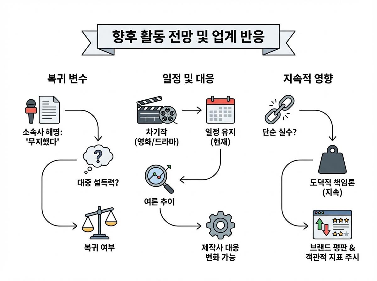 - 현재 예정된 차기작 영화 및 드라마 일정에 즉각적인 변동은 없으나, 여론의 추이에 따라 제작사의 대응이 달라질 수 있습니다.