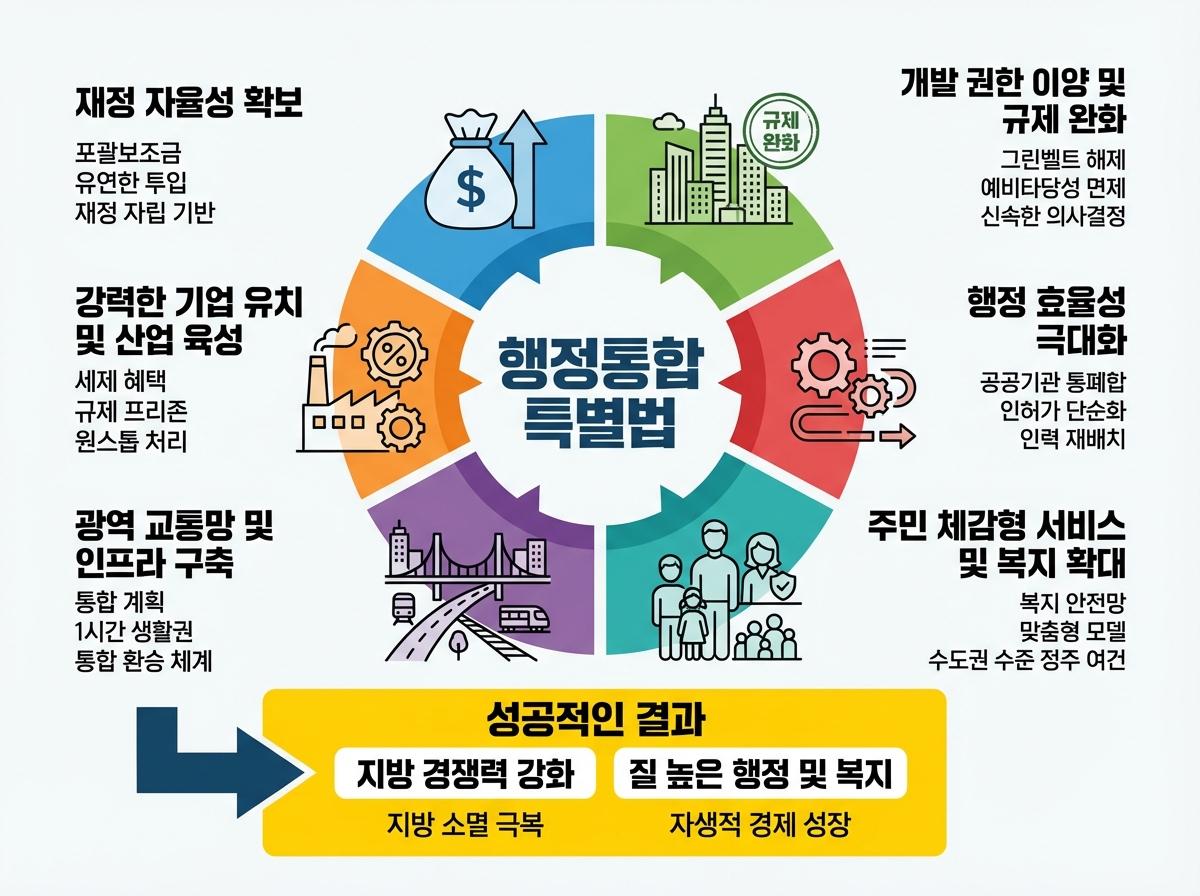 행정통합 특별법은 단순한 행정 구역의 결합을 넘어, 재정 자율성 확보와 규제 권한 이양을 통해 지방의 경쟁력을 강화하는 핵심 수단입니다.