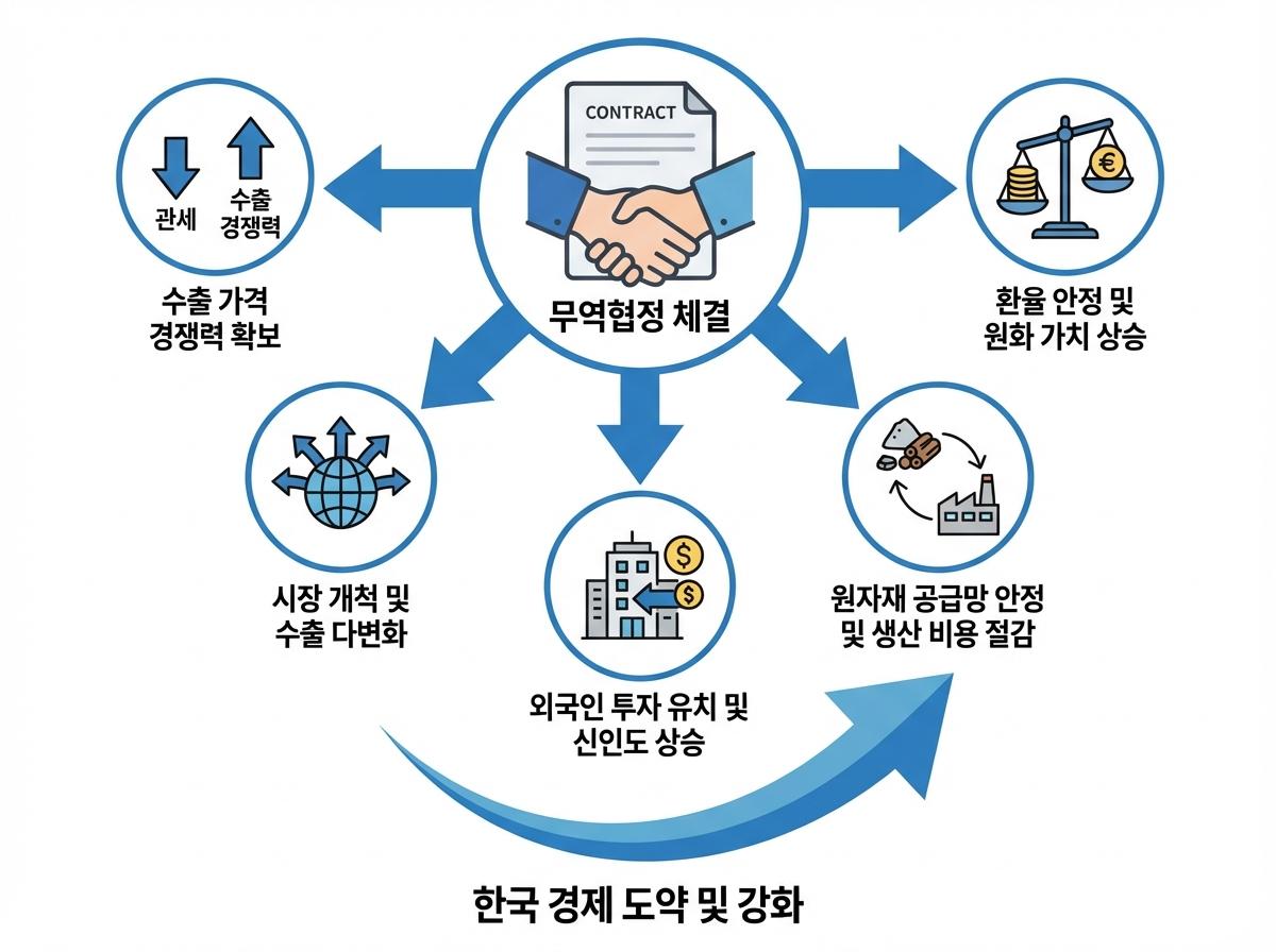 무역협정은 단순한 외교적 서명이 아니라 관세 철폐를 통해 수출 기업의 가격 경쟁력을 높이고 시장을 확장하는 경제적 도약대입니다.
