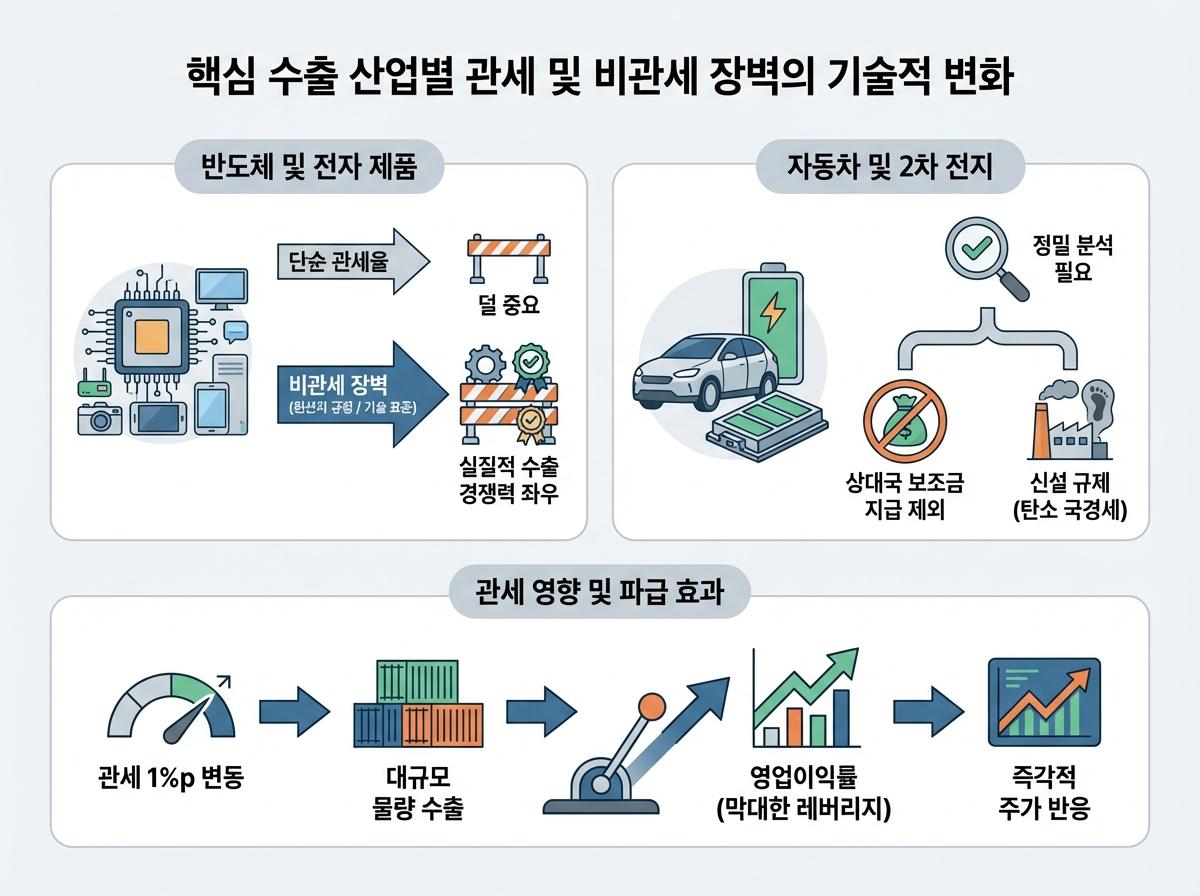 - 반도체와 전자 제품은 단순 관세율보다 원산지 규정(ROO) 및 기술 표준 인증 같은 비관세 장벽의 완화 여부가 실질적인 수출 경쟁력을 좌우합니다.