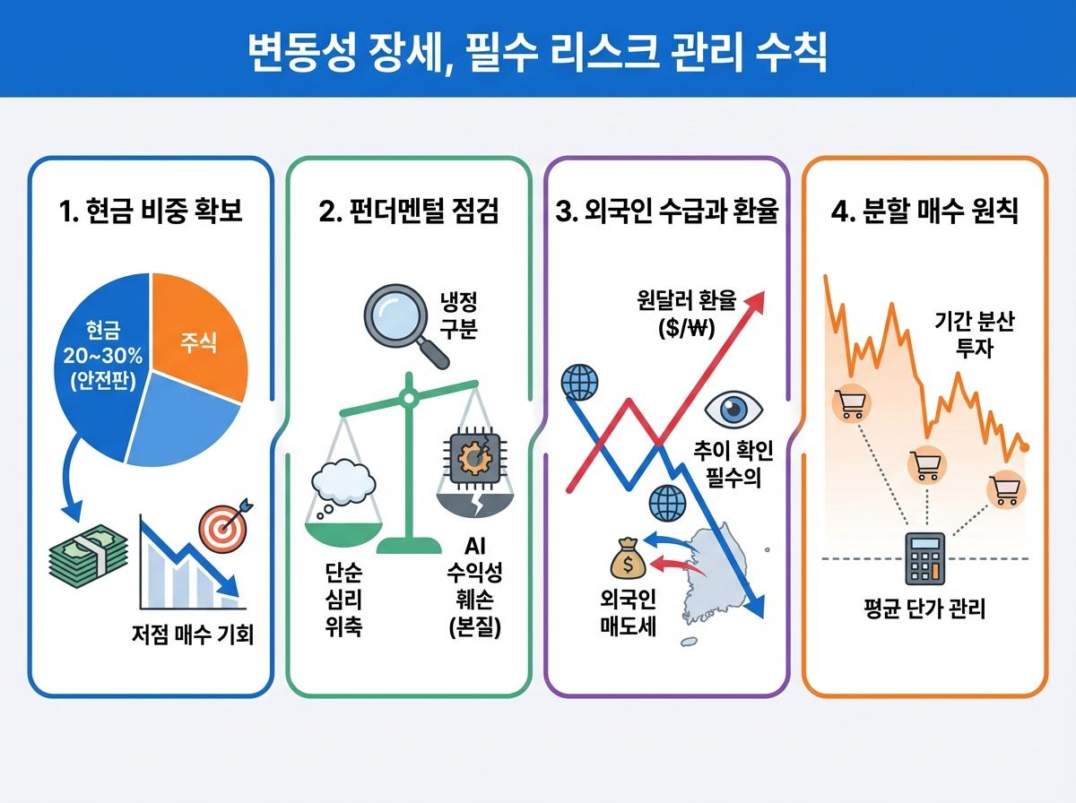 - 현금 비중 확보: 하락장이 길어질 가능성에 대비해 포트폴리오의 최소 **20~30%**는 현금으로 보유하여 저점 매수 기회를 마련해야 합니다.