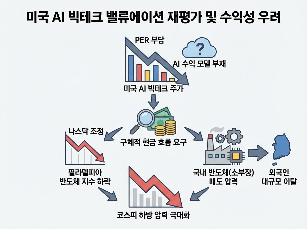 미국 AI 빅테크 기업들의 주가 하락과 수익성 우려가 국내 반도체 및 기술주에 직접적인 타격을 주며 증시 변동성을 키우고 있습니다.