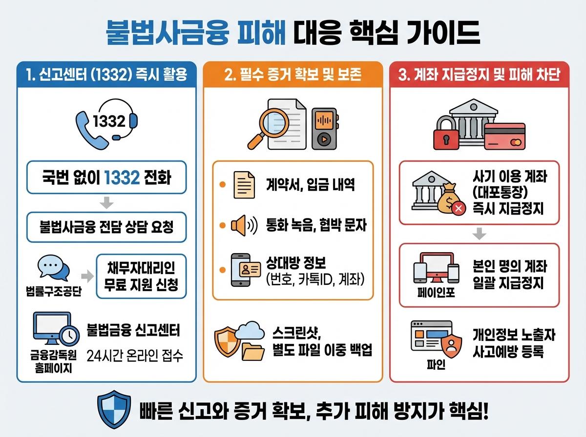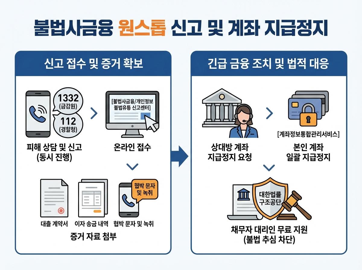 불법사금융 피해는 국번 없이 1332 또는 금융감독원 홈페이지를 통해 원스톱으로 신고할 수 있으며, 법률 지원과 함께 범죄 이용 계좌의 지급정지 신청이 가능합니다.