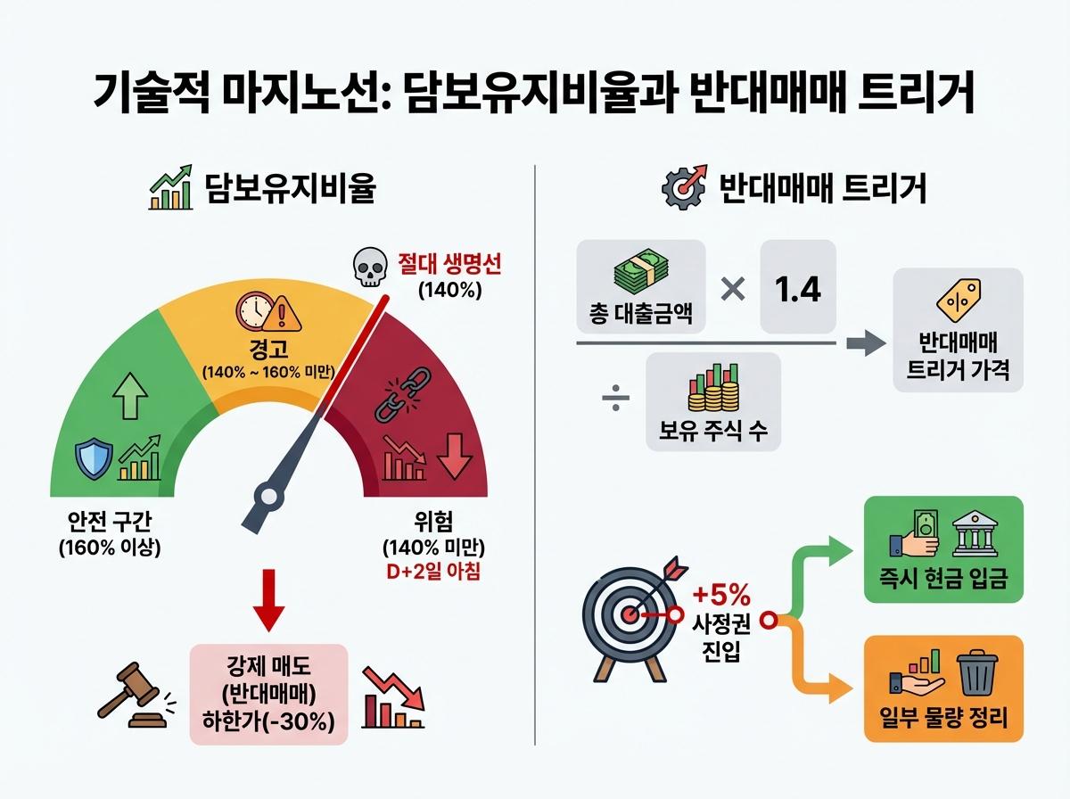 - 평가금액이 이 비율 미만으로 떨어지면 부족금을 채워 넣지 않을 시 D+2일 아침 동시호가에 **하한가(-30%)**로 강제 매도되는 반대매매가 실행됩니다.
