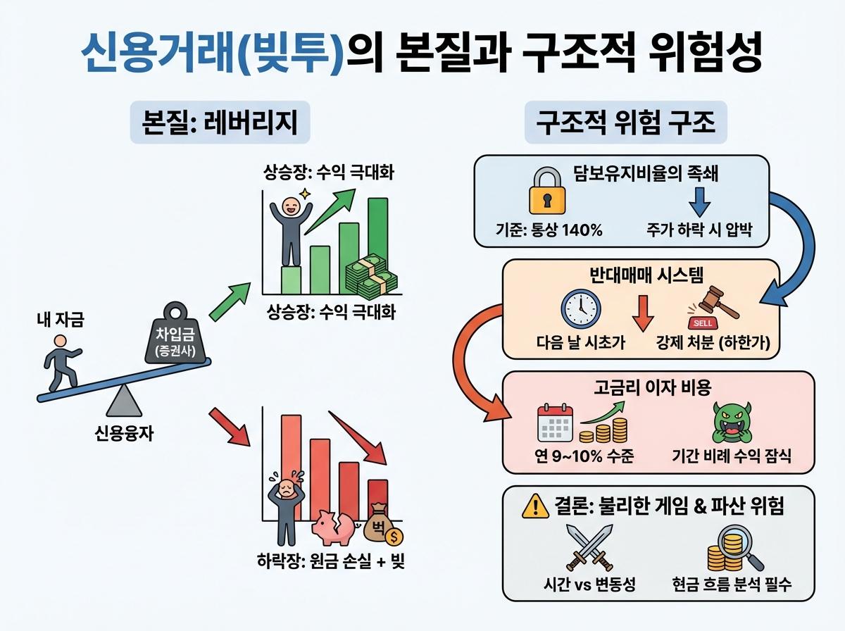 결국 신용거래는 시간과 주가 변동성이라는 두 가지 적과 동시에 싸워야 하는 불리한 게임이며, 현금 흐름에 대한 냉철한 분석 없이는 파산으로 가는 지름길이 될 수 있습니다.