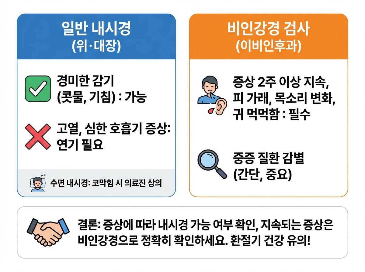 감기에 걸렸더라도 경미한 증상이라면 일반 내시경 검사는 가능하지만, 고열이나 심한 호흡기 증상이 있다면 연기하는 것이 좋습니다.