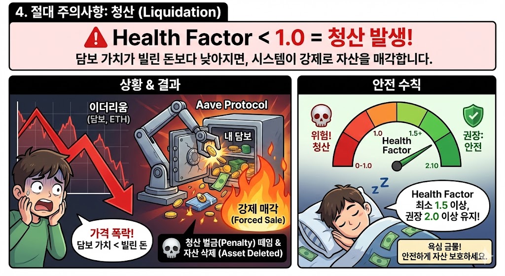 안전 수칙: 대출을 받을 때는 Health Factor를 최소 1.5 이상, 권장 2.0 이상으로 유지하세요. 욕심부려 꽉 채워 빌리면, 자고 일어났을 때 돈이 사라져 있을 수 있습니다.