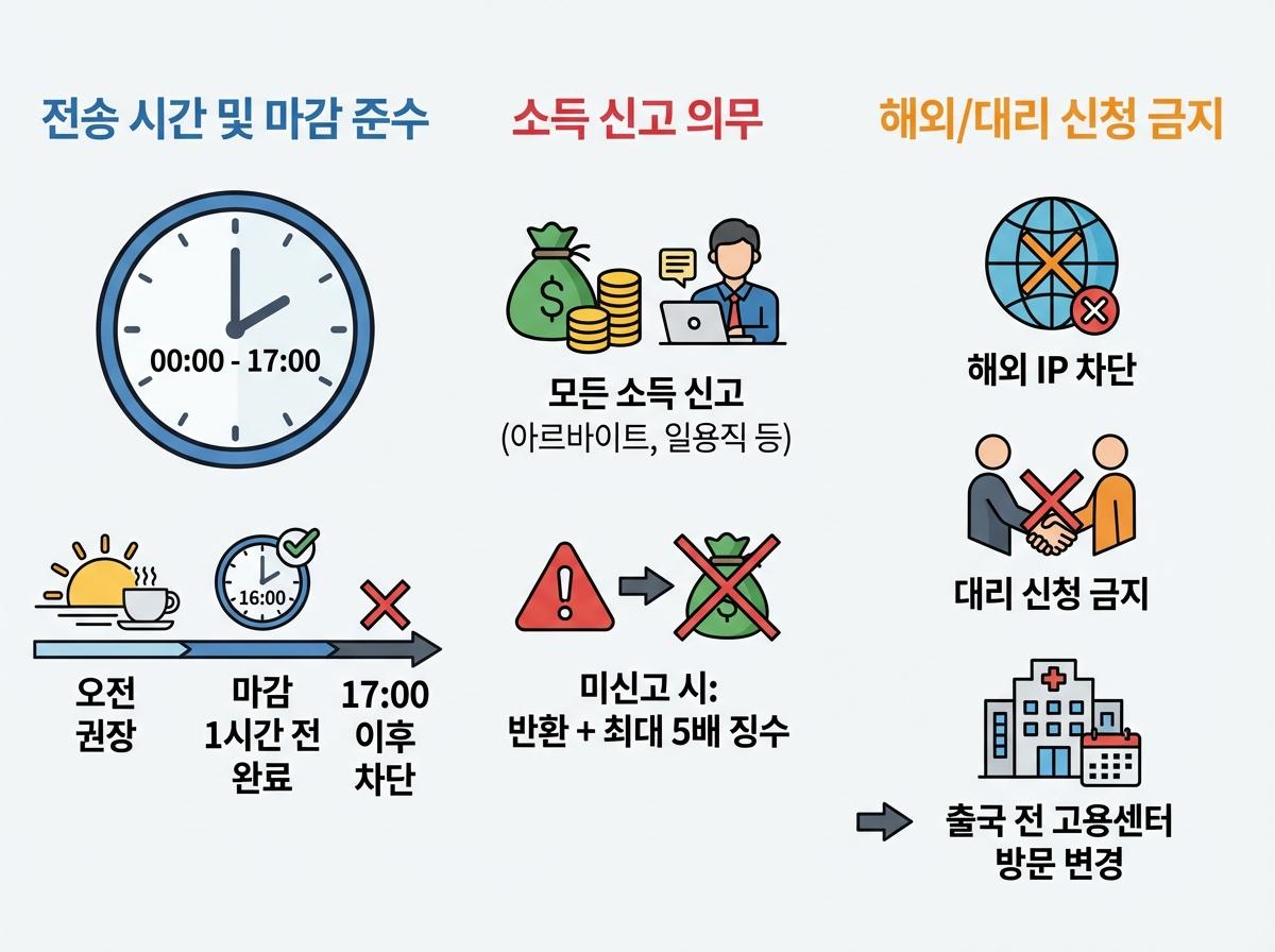 - 전산 장애 등 돌발 상황에 대비하여 마감 시간 최소 1시간 전까지는 모든 절차를 완료해야 불이익을 피할 수 있습니다.