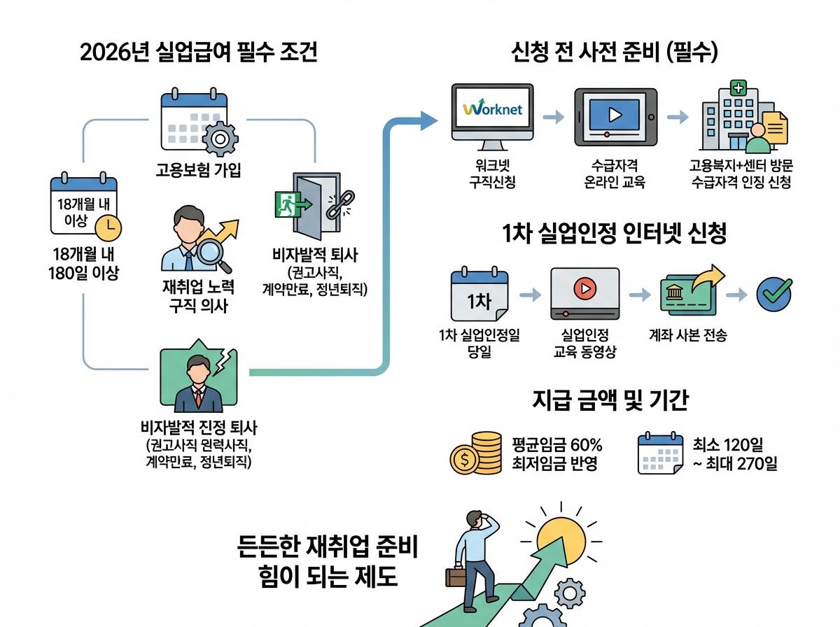 2026년 실업급여는 피보험 단위기간 180일 충족 및 비자발적 퇴사 시 신청 가능하며 워크넷 구직신청과 사전 교육 이수가 필수적입니다.