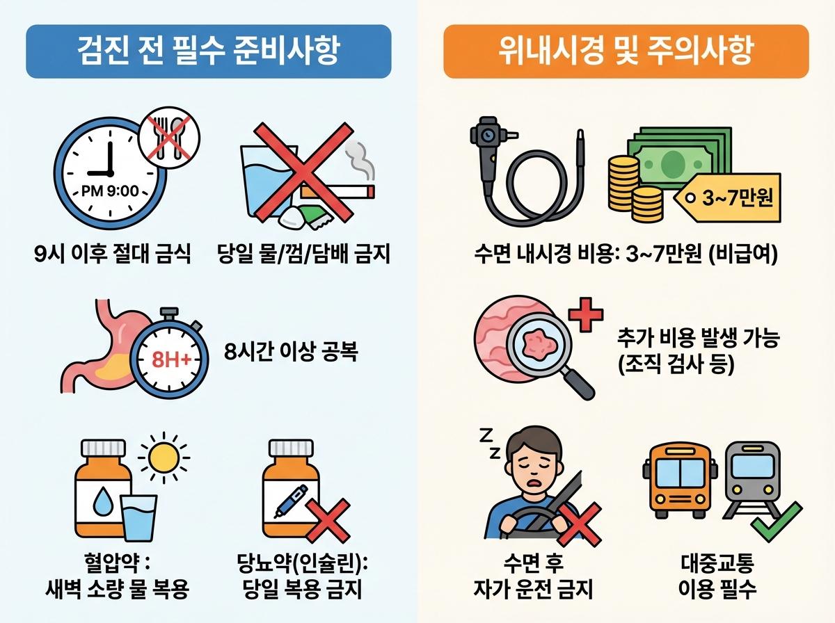 - 정확한 검사를 위해 검진 전날 저녁 9시 이후부터는 반드시 **금식(물 포함 금지)**을 지켜야 합니다.