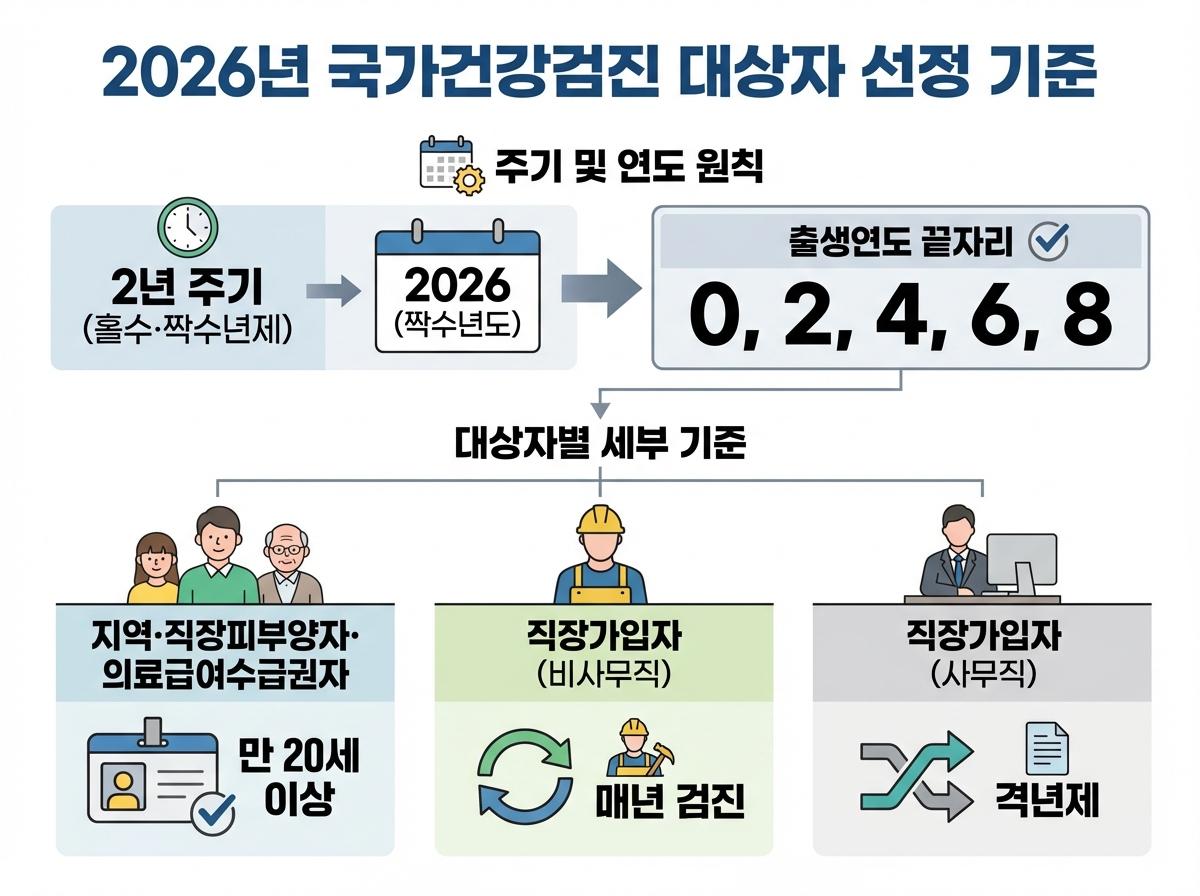 - 국가건강검진은 2년 주기의 홀수·짝수년제로 운영되며, 2026년은 짝수년도에 해당합니다.