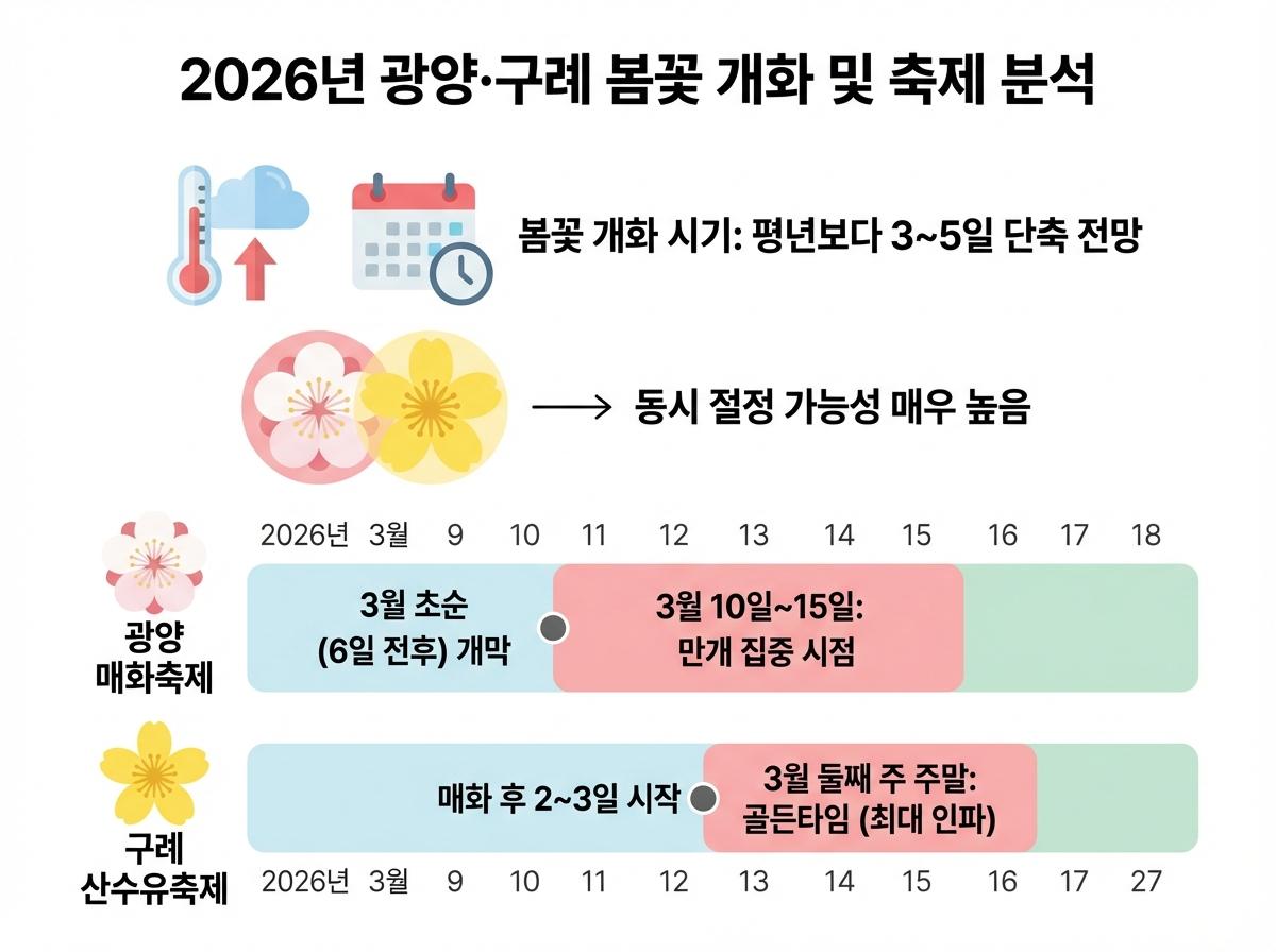 지구 온난화의 영향으로 매화와 산수유의 개화 간격이 좁아지며, 두 축제가 동시 절정을 이룰 가능성이 매우 높습니다.